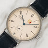 The Tangente is a trend setting and multiple prizewinning design from NOMOS and typical their unique Bauhaus aesthetic. This particular model, circa '07 features a rotating and patented power reserve indicator, date function and small seconds, all powered by a high quality movement. The dial this example houses has aged to a gorgeous and even cream tone that makes it stand out from the pack. It retains its correct box, warranty papers, booklets, original strap and signed pin buckle. For anyone looking for clean, design forward piece that understated, this set makes for a great option.